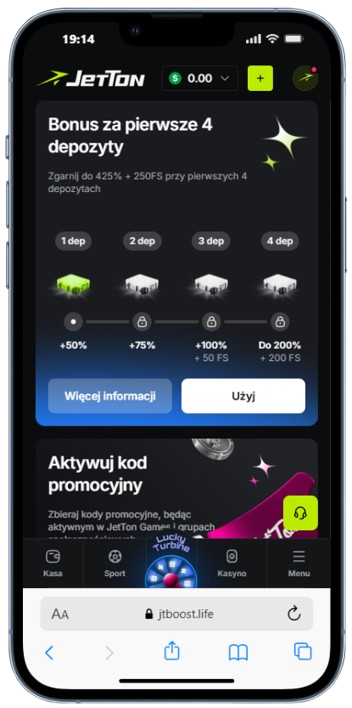 - Aktywuj Bonus: W większości przypadków Twój JetTon bonus powitalny zostanie aktywowany automatycznie po zaksięgowaniu wpłaty spełniającej minimalne wymogi (zazwyczaj 20 PLN). W przypadku niektórych promocji może być wymagane wybranie oferty w panelu wpłaty.